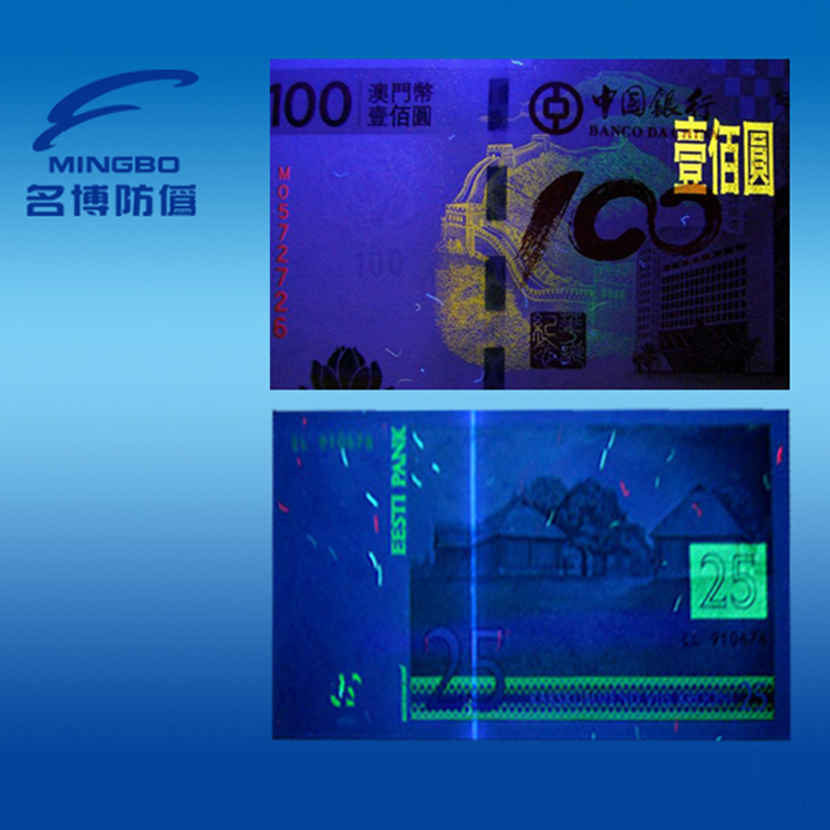 6、無色防偽油墨和普通有色油墨的顏色搭配。無色熒光紅油墨印普通油墨,熒光效果最好;無色熒光紅油墨印普通藍(lán)墨或無色熒光藍(lán)印普通紅墨效果較差,所以底色的深淺不同,對熒光亮度有較大影響,油墨底色越深熒光效果越差。
